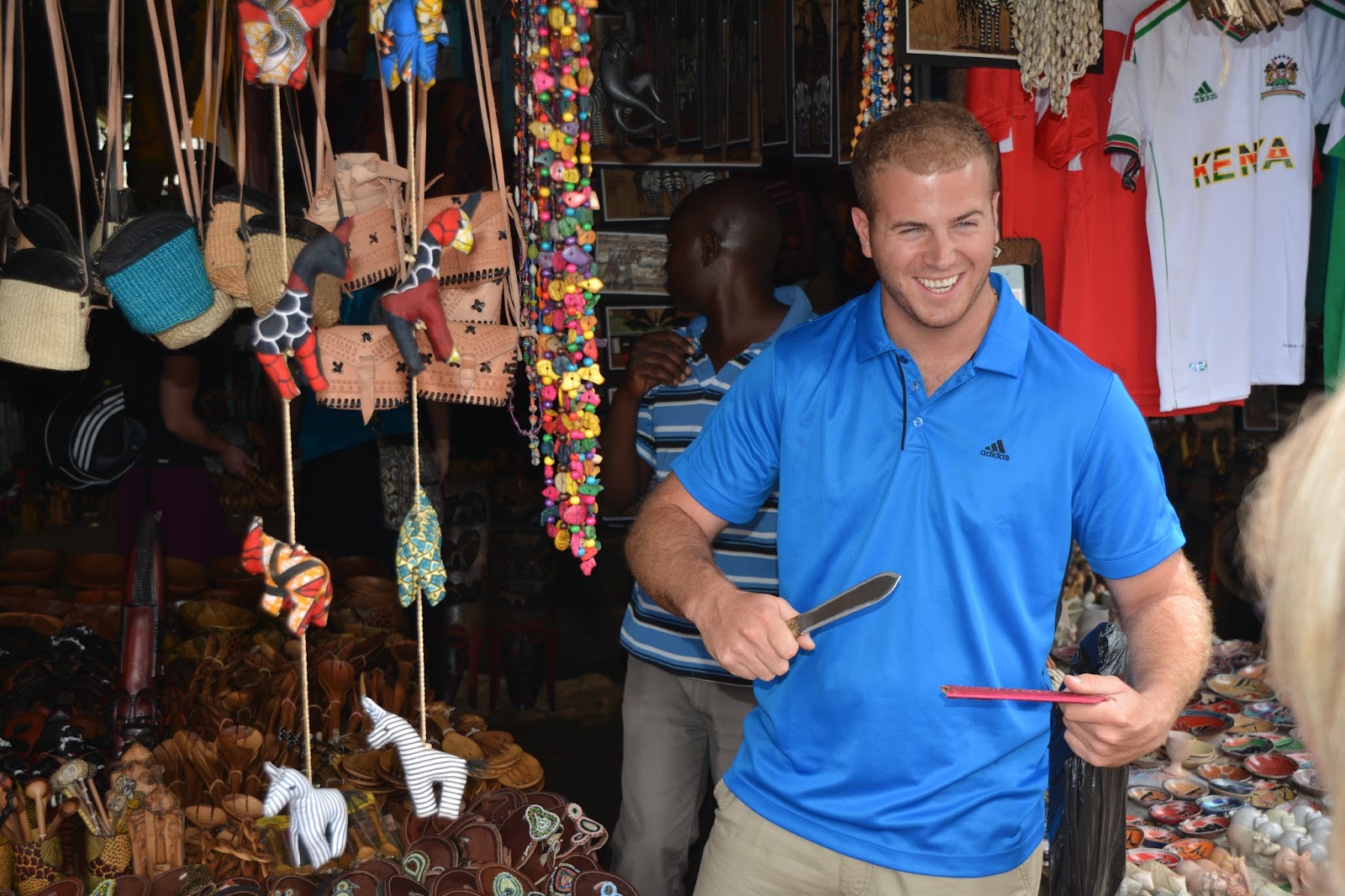 From there we went to the Masai Market. Kevin and I love to haggle with the people here. It's actually a lot of fun if you don't let the hawkers get to you... and there are a lot of them. Beatrice runs one of the first shops on the left. I like going to her because she remembers me and gives me pretty good pricing. We divided and conquered. Kevin took half the crew and I took the other half. I had a ball, and I think Kevin did, too. It's great to see him so immersed in the culture here. He has no problem standing and talking to just about anyone. He really feels at home here.